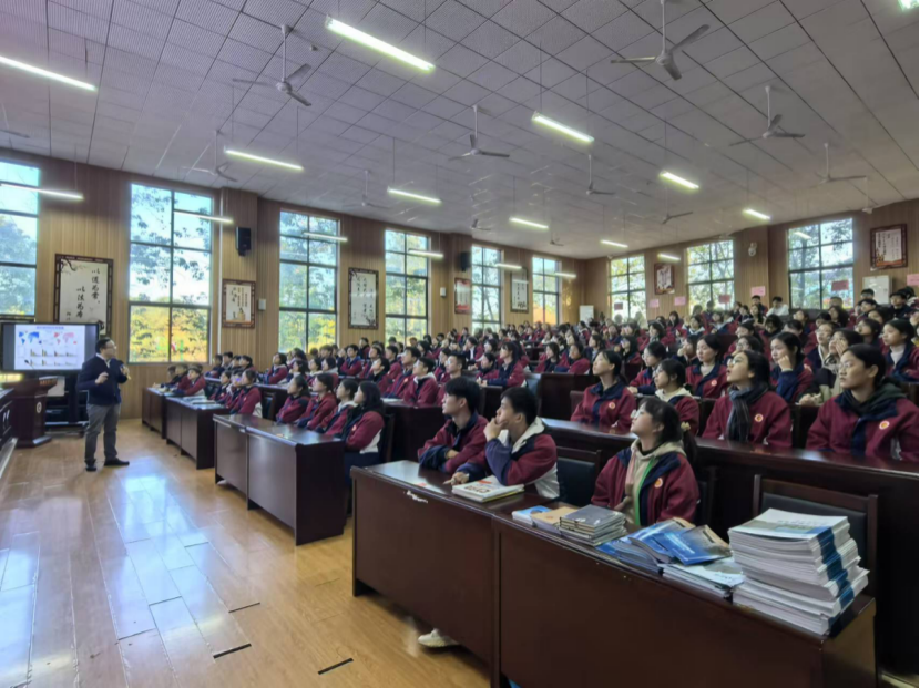 吴风收教授聚焦“肿瘤光学诊断与治疗”,为百余名高三学生作专题报告。在讲座中,吴风收教授深入浅出地向高三学子介绍肿瘤光学诊断与治疗这一前沿领域。他从基础概念讲起,逐步深入到复杂的技术原理和应用前景,结合生动的临床案例和形象的图片、视频资料,让同学们对这一专业性极强的领域有了初步的认识和理解。同学们不仅全神贯注地聆听,还认真记录着关键知识点。