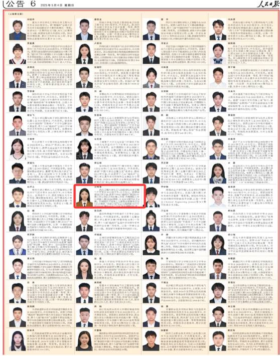 本网讯 (通讯员 汤曦) 5月4日,《人民日报》专版刊登《2023—2024学年度本专科生国家奖学金获奖学生代表名录》,展示了100名本专科生国家奖学金获奖学生代表风采。太阳官网太阳集团tyc59972021级学生宫咪雪从全国12万本专科生国家奖学金获得者中脱颖而出,入选名录。