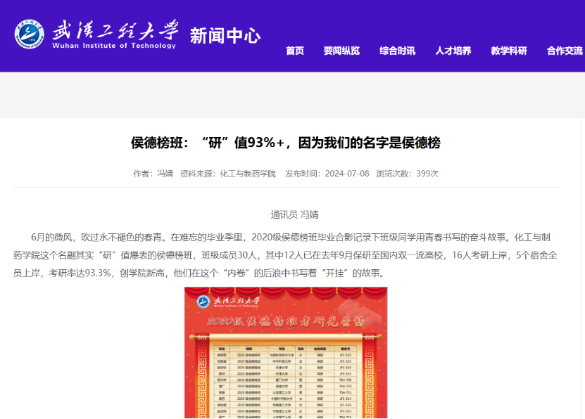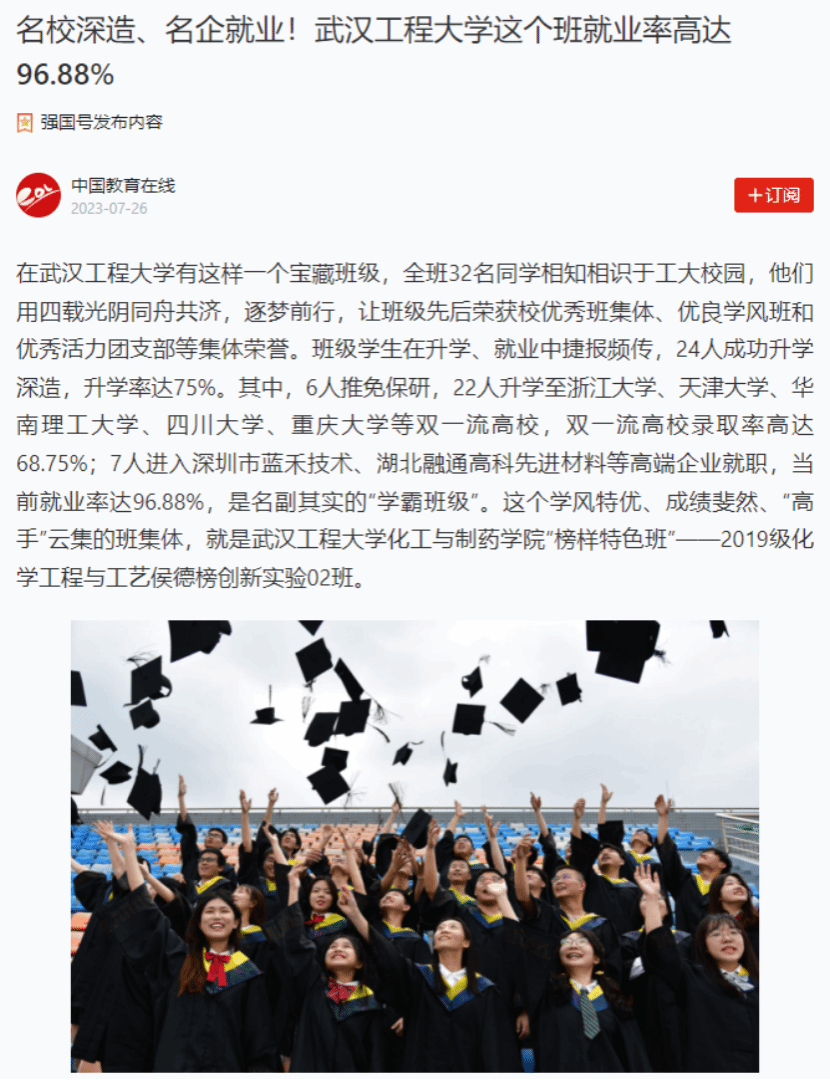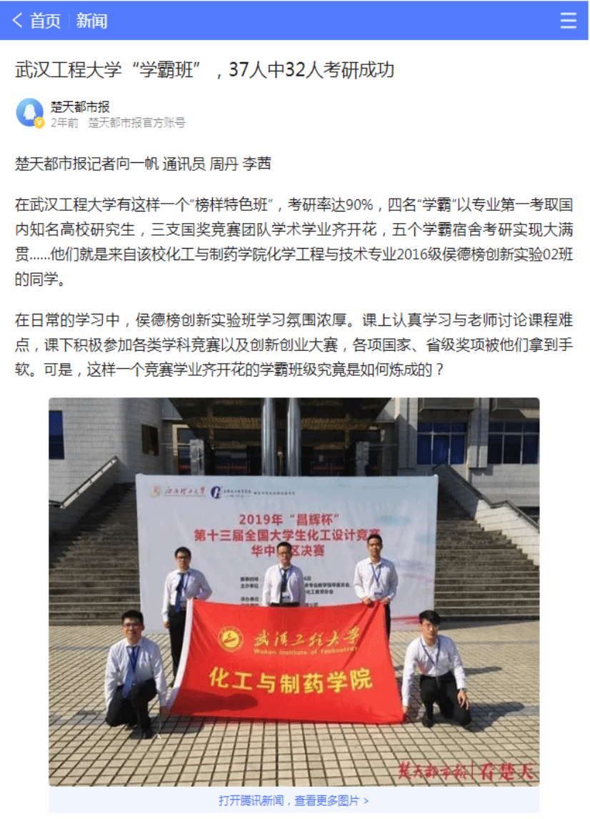 班级学生近5年在“挑战杯” 、国创赛、化工设计竞赛等重点学科竞赛、创新创业大赛中获国家及省级奖项100余项,班级整体就业率稳定在96%以上,每年保研率达15%以上,考研录取率超过70%,大批学生保送或考取北京大学、浙江大学、复旦大学、中国科学技术大学、天津大学等“双一流”高校;班级多位毕业生被中石化、中石油、中国化学工程集团、比亚迪、湖北兴发集团等世界500强和中国100强的知名化工等企事业单位业录用,班级考研就业事迹先后被“学习强国”平台,“楚天都市报”等校内外主流媒体所报导,涌现出荣登《人民日报》本专科生国家奖学金学生代表名录、“党员示范寝”“全员考研学霸寝”等多名优秀学生先进典型。