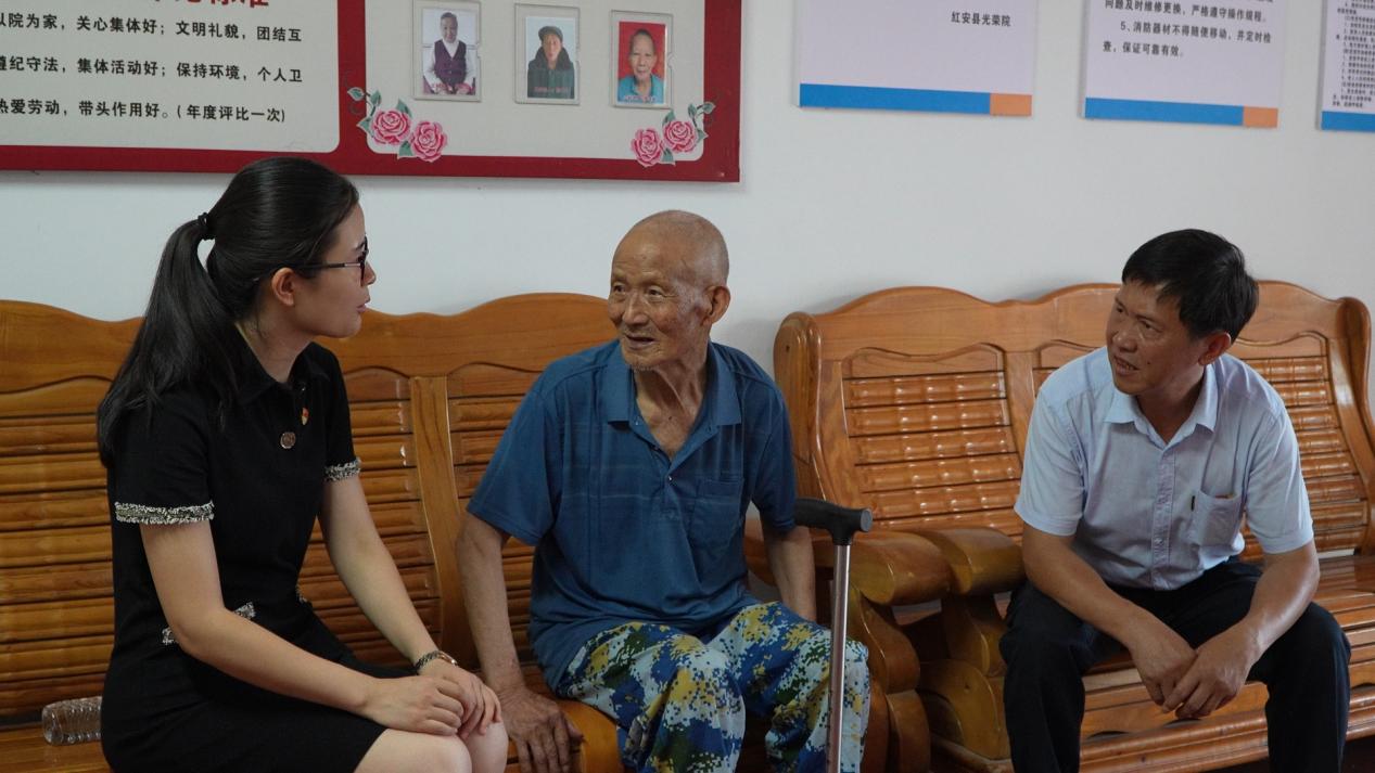 实践团成员们来到红安县光荣院拜访“英烈守护人” 、荣获全国道德模范提名奖的姜能山老人。姜老为大家讲述了他义务为红军烈士守墓60多年的初心,寄语青年人要“好好学习,天天向上,紧跟党走”!