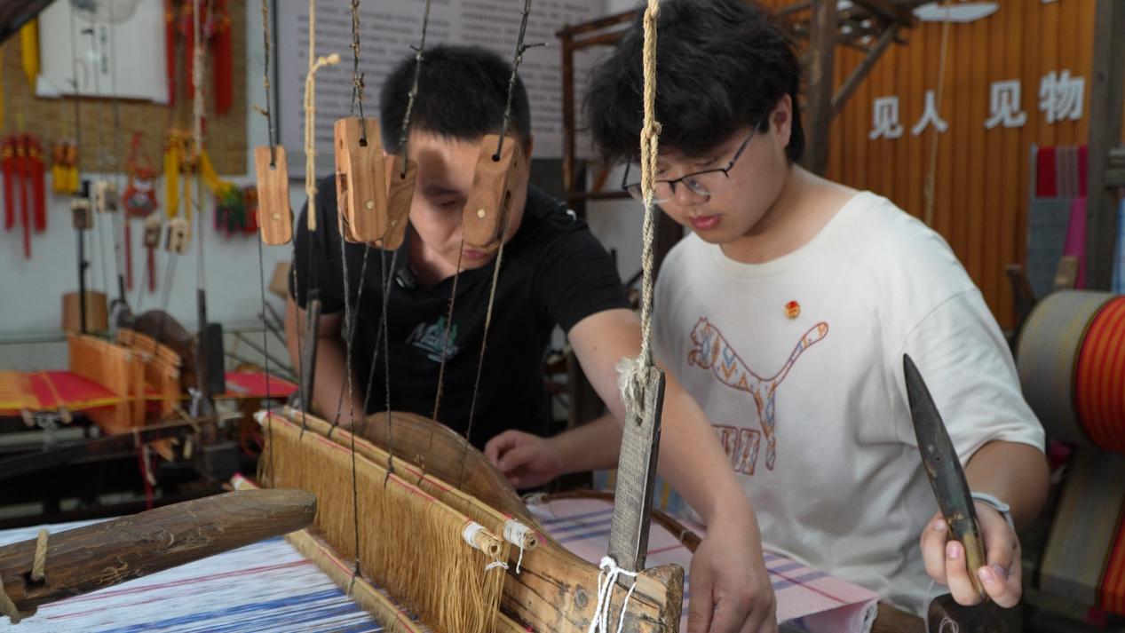 图为实践团成员在陶文成地指导下亲自动手织红安大布( 吴祥宇 摄)